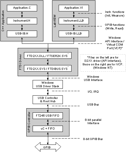 FTDI driver passes data through Windows USB driver stack to the FTDI chip in the GPIB controller.