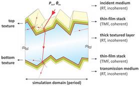 - kombinirani optični model (3D sledenje žarkov + 1D metoda prenosnih matrik) za natančno analizo nekoherentnega in koherentnega širjenja svetlobe